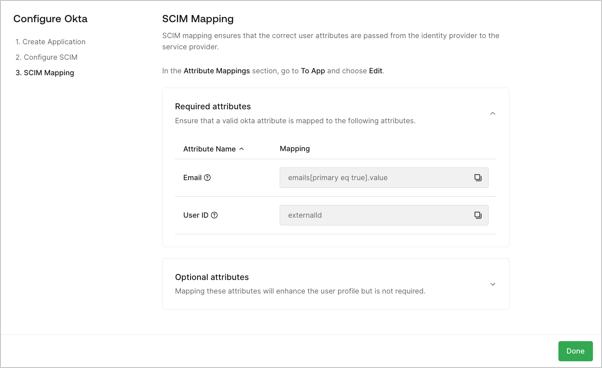 Review the required and optional attributes defined in the User Attribute Profile (UAP). Map these attributes to the corresponding SCIM fields in their IdP system.