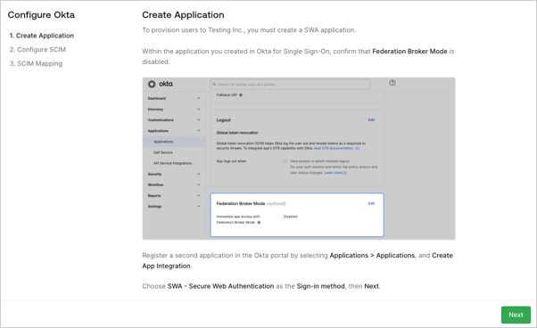 Create Application: The customer admin follows the written instructions to create an application in their selected IdP system.