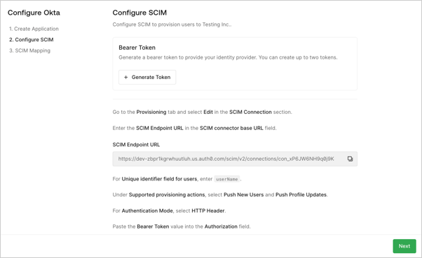 Generate a SCIM bearer token in the assistant and copy the SCIM bearer token and SCIM endpoint URL into their IdP’s configuration.