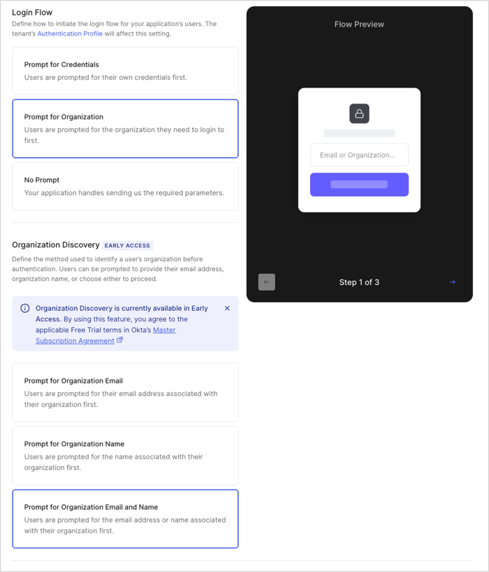 Most organizations should choose Prompt for Credentials, then enable Identifier First Authentication. If you already know the Organization with which a user is attempting to log in, the No Prompt option along with Custom Development with Organizations allows your app to maintain a branded and customized login flow.