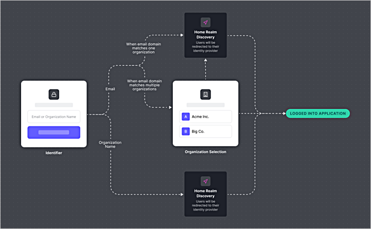 Once the organization (if any) is determined, Auth0 applies Identifier First Authentication with Home Realm Discovery: